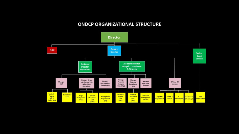 The staff component of the organization spans a cadre of enthusiastic and efficient persons who are continuously championing the cause of eradicating the prevalence of illicit narcotics, money laundering and the financing of terrorism. The ONDCP comprises of several units/departments which contribute to the successful achievement of our mandate.