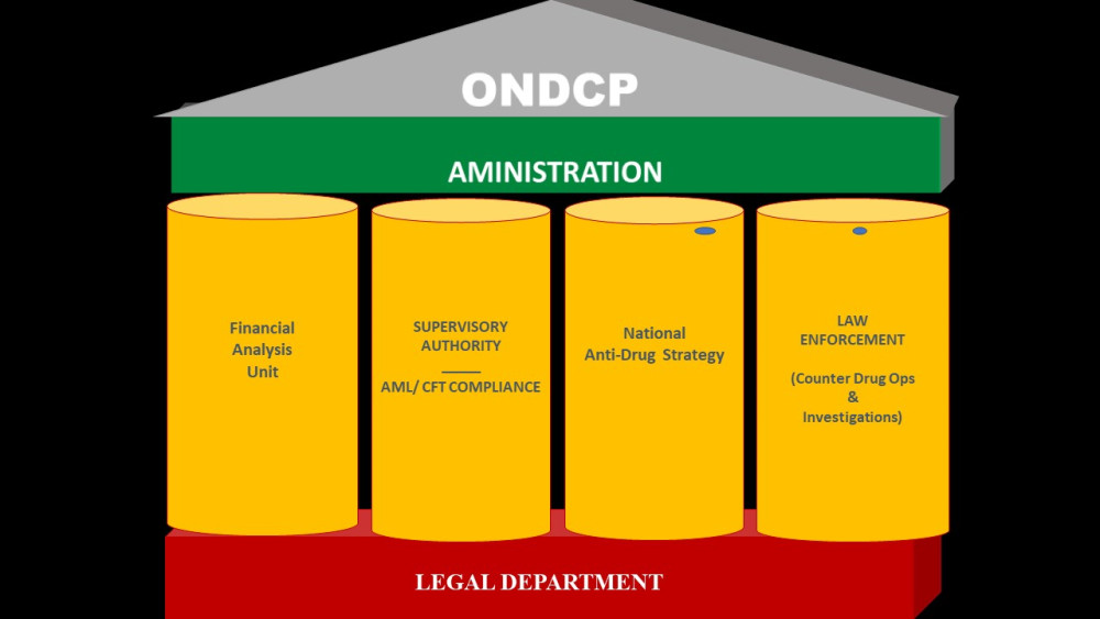 The operational structure of the ONDCP can be described as a house which is firmly built upon its legal foundation ensuring that all activities undertaken by the agency is grounded in law; the three supporting pillars of Financial Intelligence/Financial Investigations, Supervisory Authority/AML CFT Compliance and finally the Counter Narcotics Operations are the operational arms that enforce the mandate of the ONDCP Act 2003 and other relevant legislations. These pillars are covered by the Administration Department who provides administrative and logistical support to the Agency in providing support to the departments.